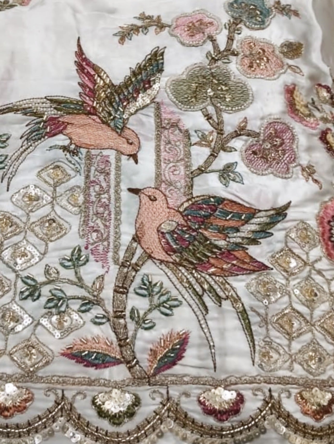 The Avesa Set is a refined three-piece ensemble featuring delicate bird and floral embroidery throughout the design. The fitted blouse is finished with fabric buttons and paired with wide palazzo trousers that showcase the intricate artwork along the hem. A lightweight dupatta completes the look with soft movement and elegance.