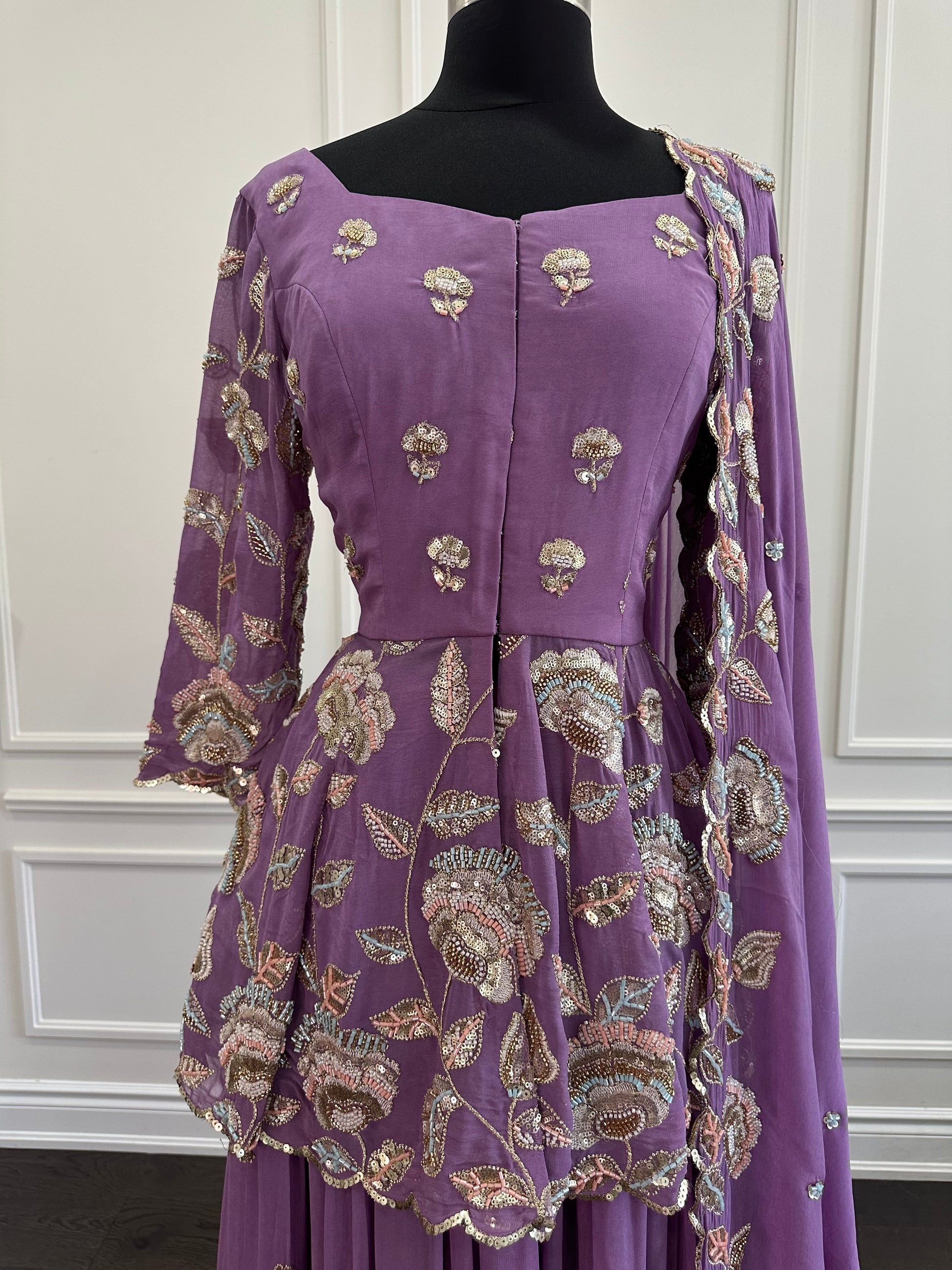 Every detail is meticulously hand-worked, showcasing intricate stone embellishment, sequins, and fine thread embroidery throughout the ensemble. The peplum cut adds a modern edge while maintaining the richness and grace expected from a couture Indian outfit.
