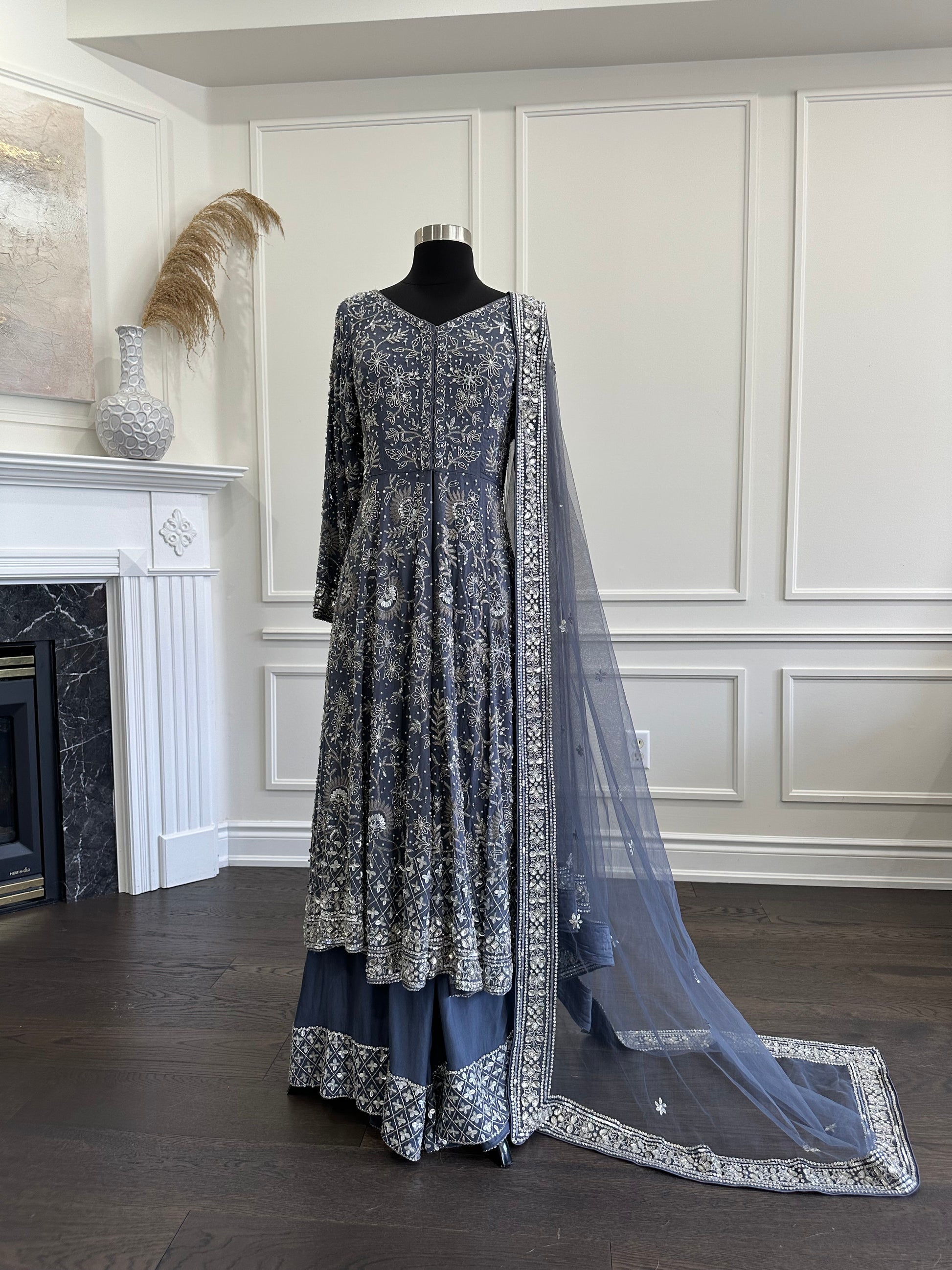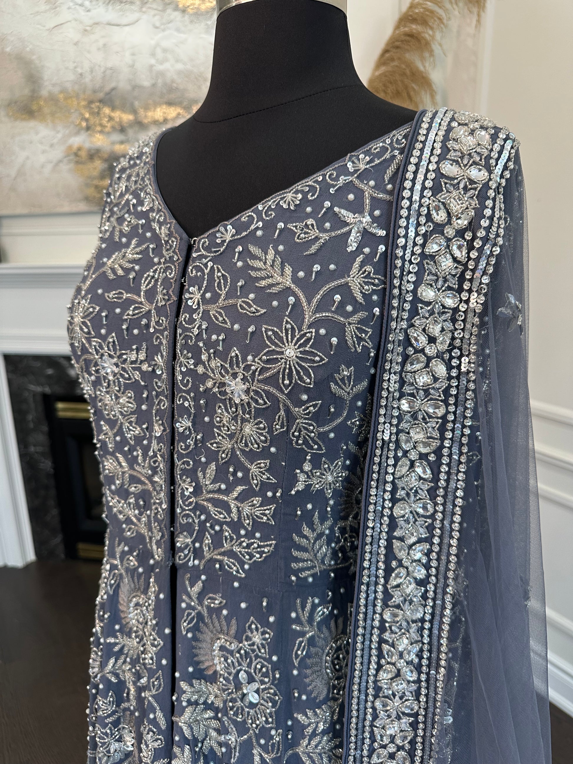 Grey & Silver Handcrafted Jacket Suit with Palazzo & Net Dupatta