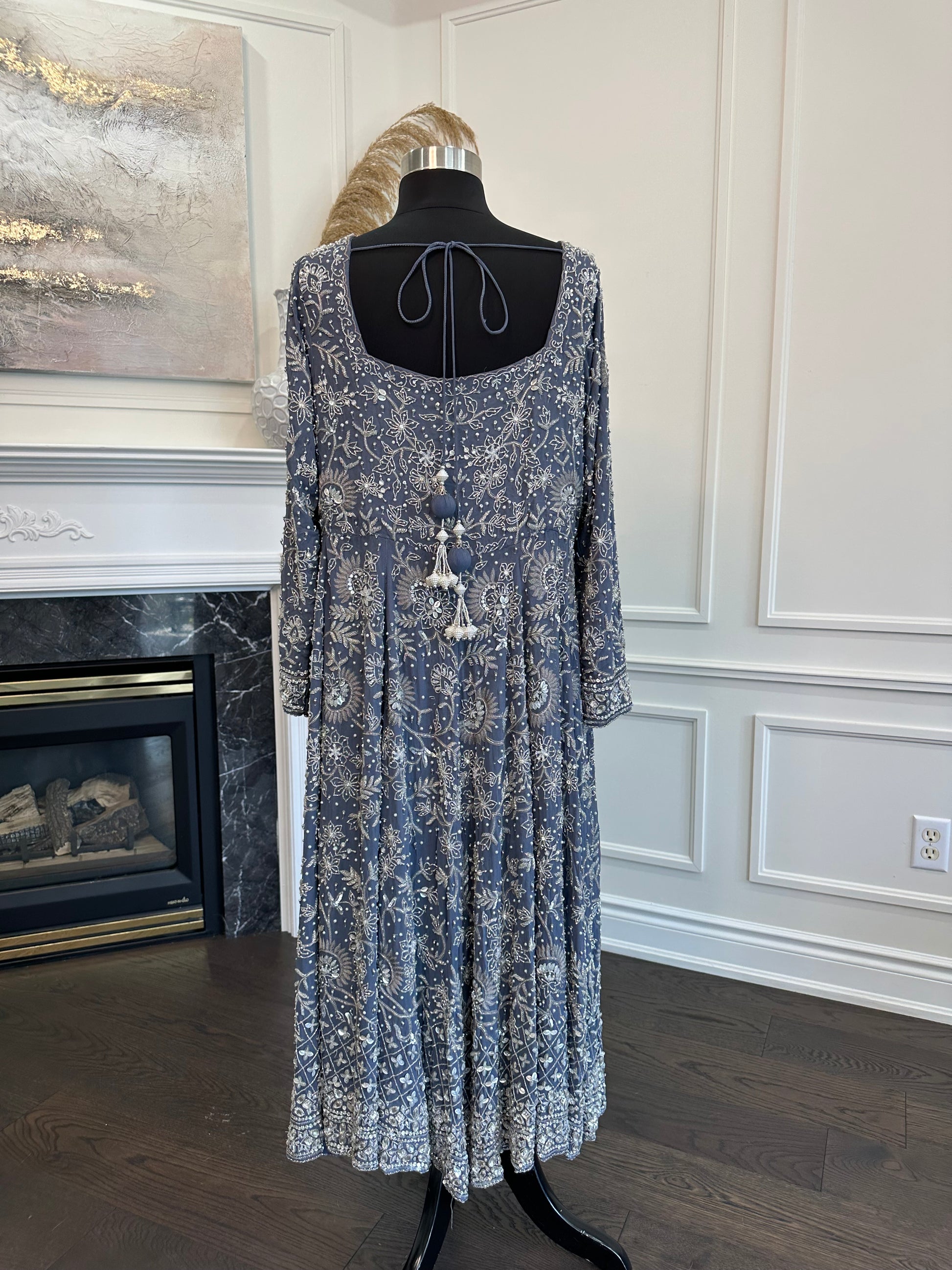 Step into elegance with this grey and silver handcrafted jacket suit, designed for those who appreciate luxury and timeless style. This exquisite ensemble features a full-length jacket adorned with intricate handwork stone detailing, exuding sophistication and grace. Paired with a matching palazzo, embellished with delicate handwork, this outfit offers a seamless blend of modesty and high fashion.